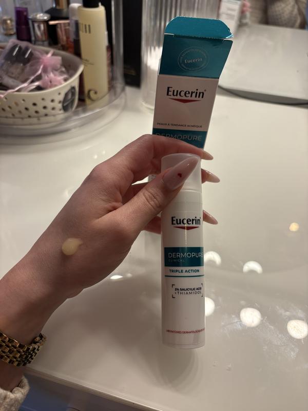 Thiamidol is een exclusief en gepatenteerd** actief ingrediënt dat werd ontwikkeld tijdens een 10 jaar durend onderzoeksproject. Het vermindert post-inflammatoire hyperpigmentatie door de oorzaak ervan aan te pakken: de productie van melanine in de huid. Veel bekende ingrediënten hebben alleen tests op paddenstoelenenzymen ondergaan in plaats van op enzymen van de menselijke huid. De effectiviteit van Thiamidol in onze Eucerin® Dermopure Triple Action is aangetoond in testen onder praktijkomstandigheden. Klinische studies* en andere responsen hebben aangetoond dat onze formule effectief post-acne vlekken vermindert.