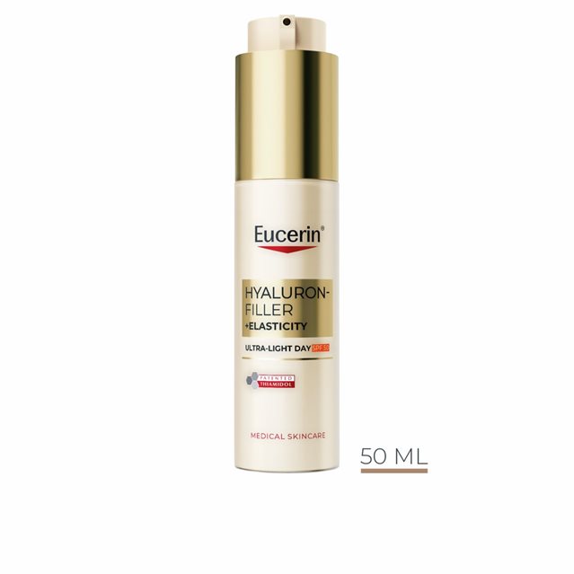 Anti-age dagcrème met een vloeibare textuur voor de huid met vroegtijdige tekenen van veroudering. Eucerin Hyaluron-Filler + Elasticity Ultralichte Dagcrème SPF 50 is een vloeibare anti-age dagcrème die de elasticteit van de huid verbetert en alle soorten donkere vlekken corrigeert**. De unieke formule biedt meerdere anti-age voordelen. De Collageen-Elastin Booster, een combinatie van Hyaluronzuur en Creatine, ondersteunt de natuurlijke productie van collageen*** en verbetert de elasticiteit van de huid. Eucerins gepatenteerd* Thiamidol vermindert de zichtbaarheid van donkere vlekken en voorkomt de terugkeer ervan. Voor een gladdere huid die meer straalt en er jonger uitziet. De ultralichte vloeibare dagcrème bevat ook een onzichtbare zonnebescherming, met UVB-filter SPF 50 en UVA-filter om door UV veroorzaakte vroegtijdige huidveroudering en het dieper worden van rimpels effectief te voorkomen.